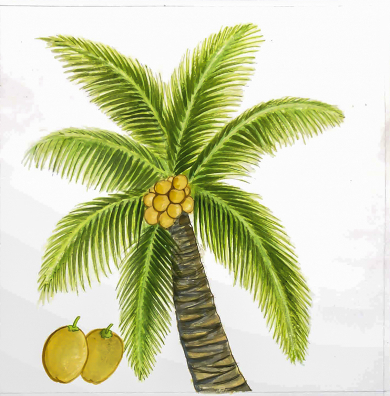 Coconut TreeThis is the coconut tree (Cocos nucifera), a member of the palm tree family. It is highly regarded in India and Hawaii, and was one of only 26 plants that the Polynesians brought to this island in their canoes centuries ago. The coconut also has cultural and religious significance in certain societies, particularly in India, where it is used in Hindu rites. Breaking a coconut at a temple is a blessed offering.
