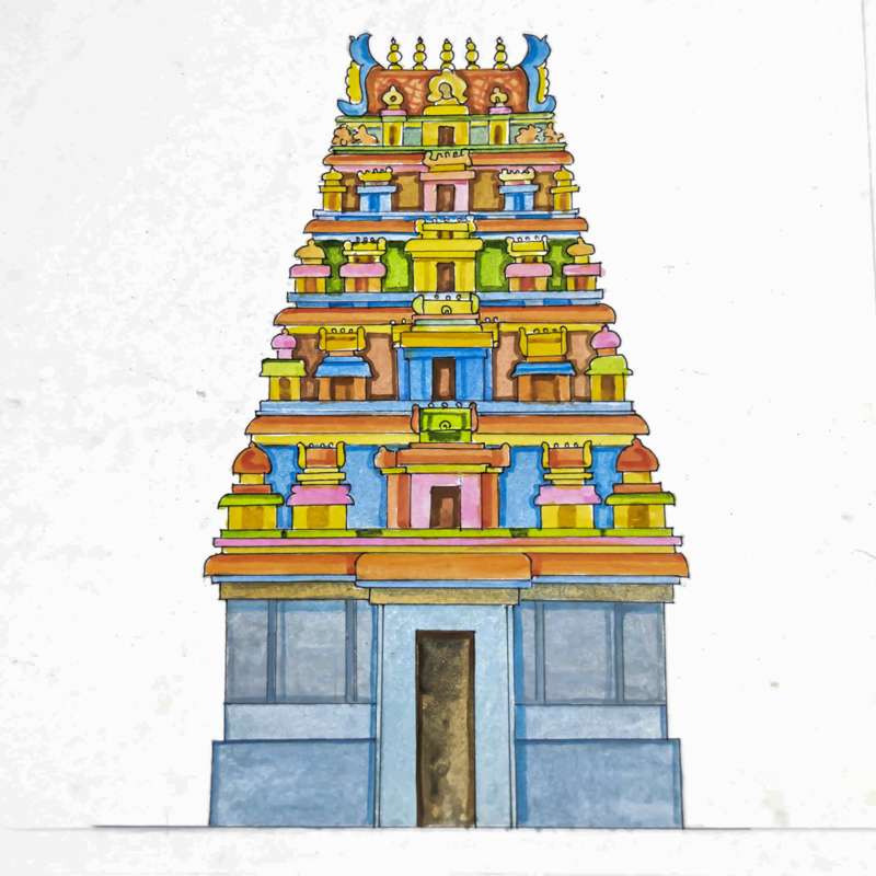 GopuramThis depicts a Gopuram, the monumental tower, usually ornate, at the entrance of a Hindu temple, especially prominent in South Indian temples.