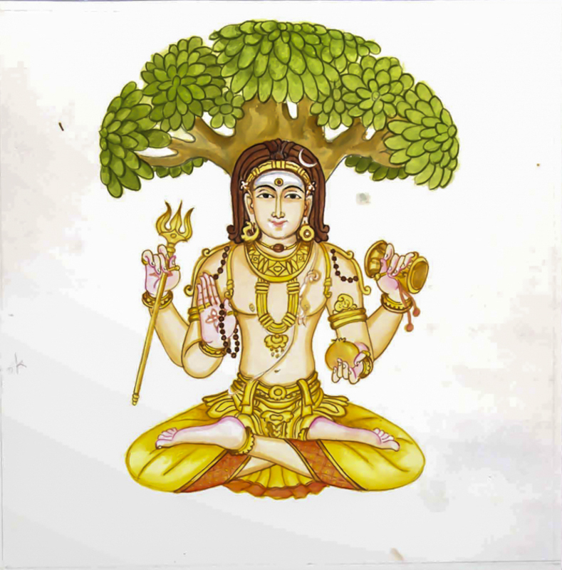 DakshinamurtiThis is Dakshinamurti, the “South-facing form.” Lord Siva is depicted as the silent guru sitting under a banyan tree, silently teaching four rishis at His feet. A 12-foot-tall granite Dakshinamurti is located just north of Iraivan Temple, and the sutra, central thread, of this temple is lined up with Siva’s third eye.