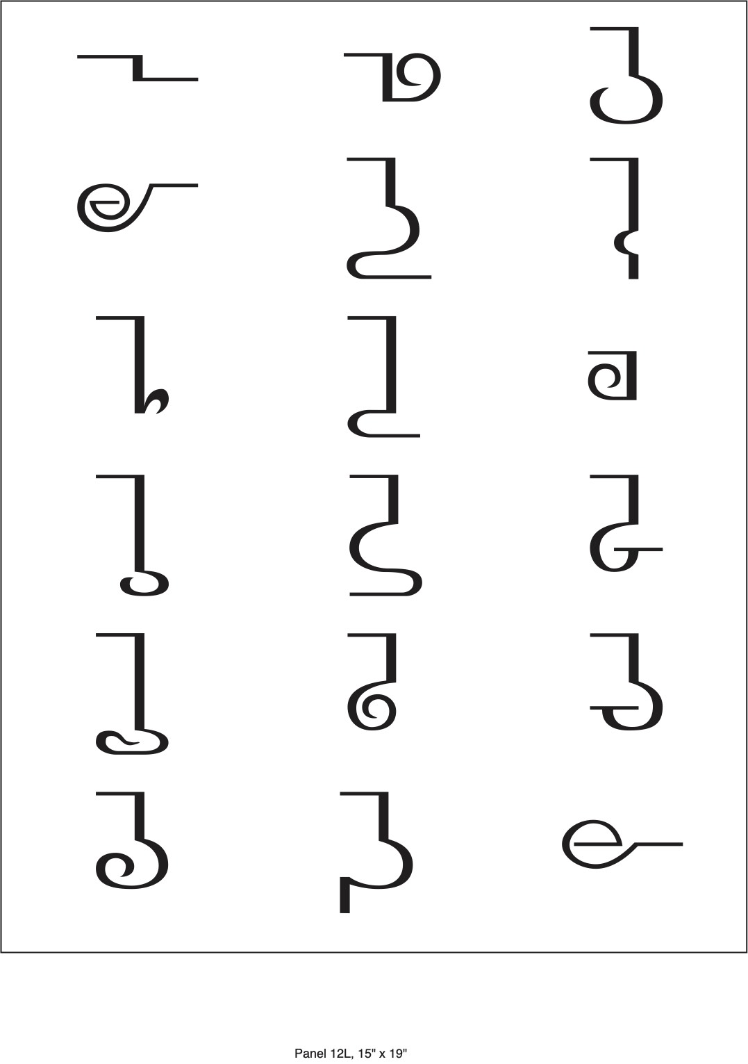 Basic Shum alphabetThis is the basic Shum alphabet—its first 18 letters and sounds. It is a meditation in Gurudeva’s language of meditation and one of the 12 meditations he asked us to carve on the pillars. The letters begin from the top of the left column: ee, mm, ing, ling, li, ni, ka, sim, vum, reh, tya, ah, bi, oo, na, si, di, shum.