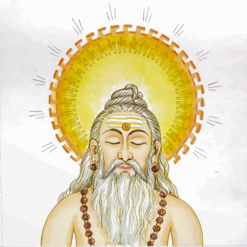 SamadhiHere a meditator has transcended all lower states to enter into samadhi, indicated by his nimbus or halo. Samadhi means “enstasy, standing within one’s Self.” It also has connotations of “sameness; contemplation; union, wholeness; completion, accomplishment.” Samadhi is the state of true yoga, in which the meditator and the object of meditation are one. Samadhi is of two levels. The first is savikalpa samadhi (“enstasy with form” or “seed”): identification or oneness with the essence of an object. Its highest form is the realization of the primal substratum or pure consciousness, Satchidananda. The second is nirvikalpa samadhi (“enstasy without form” or “seed”): identification with the Self, in which all modes of consciousness are transcended and Absolute Reality, Parashiva, beyond time, form and space, is experienced. This brings in its aftermath a complete transformation of consciousness. In Classical Yoga, nirvikalpa samadhi is known as asamprajnata samadhi, “supraconscious enstasy”—samadhi, or beingness, without thought or cognition, prajna. Savikalpa samadhi is also called samprajnata samadhi, “conscious enstasy.” (Note that samadhi differs from samyama, the continuous meditation on a subject or mystic key [such as a chakra] to gain revelation on that subject or area of consciousness. As explained by Patanjali, samyama consists of dharana, dhyana and samadhi.)