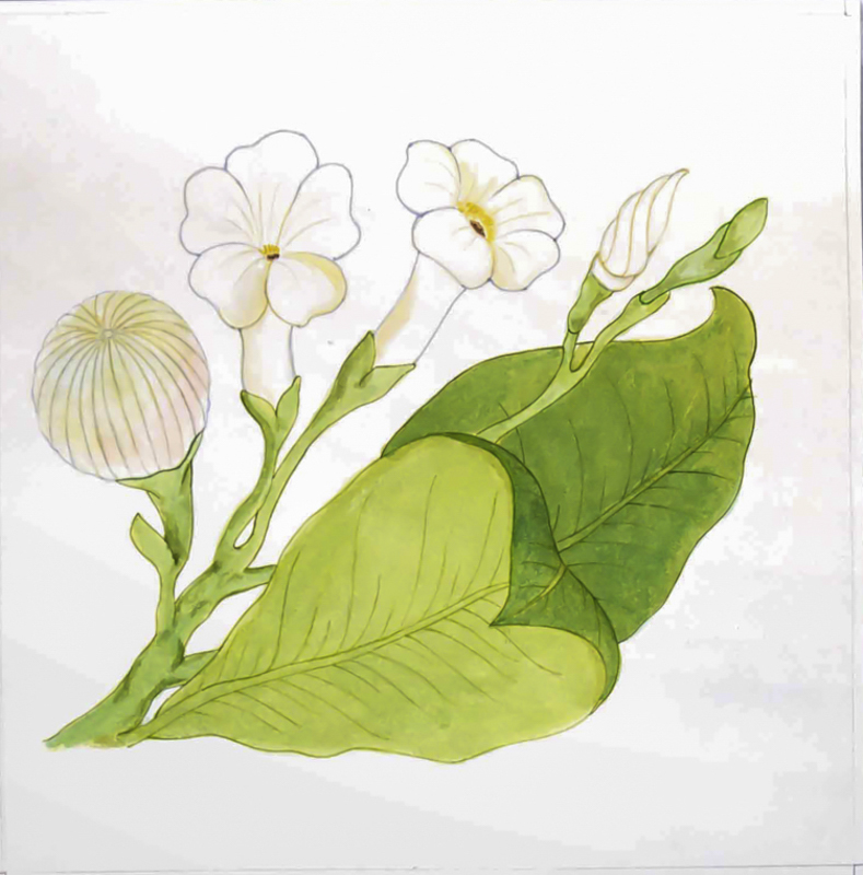 Pua KenikeniThe name puakenikeni (Fagraea berteroana) translates to “ten-cent-flower,” the price of one of the white, trumpet-shaped blooms when the tree was imported into Hawaii in the 1930s. Now added to Hawaiian leis, those highly fragrant flowers originated in northern Australia. Gurudeva designated it as the official flower of Kadavul Hindu Temple, and it lines the entryway there.