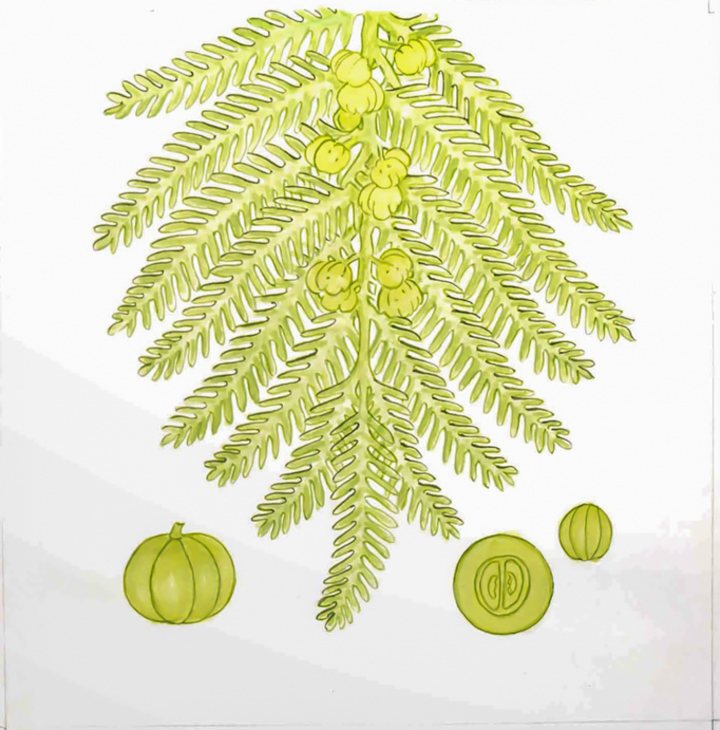 Amla or NelliThe Amla tree and fruit (Phyllanthus emblica, also known as Indian gooseberry) is famed in India and Sri Lanka, and used widely in ayurvedic medicine. It is high in vitamin C. There is a mature tree just north of the Swayambhu Lingam, not far from Iraivan Temple.