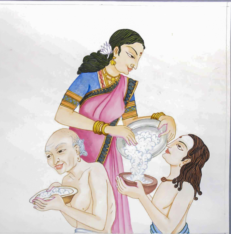 Dharma, VirtueDharma, “righteousness,” is represented here by a woman feeding hungry beggars. From dhri, “to sustain; carry, hold.” Hence, dharma is “that which contains or upholds the cosmos.” Dharma, another name for religion, is a complex and comprehensive term with many meanings, including divine law, law of being, way of righteousness, ethics, duty, responsibility, virtue, justice, goodness and truth. Essentially, dharma is the orderly fulfillment of an inherent nature or destiny. Relating to the soul, it is the mode of conduct most conducive to spiritual advancement, the right and righteous path. There are four principal kinds of dharma, known collectively as chaturdharma, “four religious laws:” 1) rita: “Universal law:” The inherent order of the cosmos. 2) varna dharma: “Law of one’s kind:” Social duty. 3) ashrama dharma: “Duties of life’s stages;” human or developmental dharma; the natural process of maturing from childhood to old age through fulfillment of the duties of each of the four stages of life—brahmachari (student), grihastha (householder), vanaprastha (elder advisor) and sannyasa (religious solitaire). 4) svadharma: “Personal path, pattern or obligation:” One’s perfect individual pattern through life, according to one’s own particular physical, mental and emotional nature.