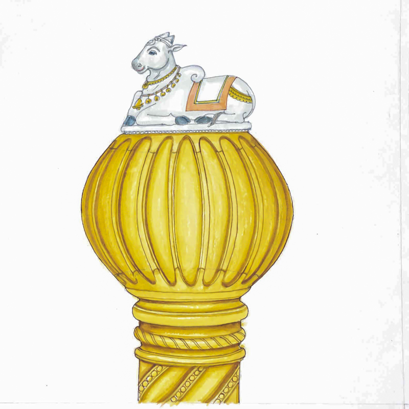 Top of Guru's StaffNandi, “the joyful,” is a white bull with a black tail. He is the vahana, or mount, of Lord Siva. Nandi is the symbol of the powerful instinctive force tamed by Siva. Here Nandi sits atop the holy danda, the spiritual staff of the head of the Aadheenam.