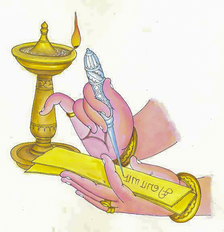 Rig VedaThe Rig Veda is being scribed on a palm leaf using a metal stylus. The first and oldest of the four Veda corpora of revealed scriptures (Sruti), including a hymn collection (Samhita), priestly explanatory manuals (Brahmanas), forest treatises (Aranyakas) elaborating on the Vedic rites, and philosophical dialogs (Upanishads). Like the other Vedas, the Rig Veda was brought to Earth consciousness not all at once, but gradually, over a period of perhaps several thousand years. The oldest and core portion is the Samhita, believed to date back, in its oral form, as far as 8,000 years, and to have been written down in archaic Sanskrit some 3,000 years ago. It consists of more than 10,000 verses, averaging three or four lines (riks), forming 1,028 hymns (suktas), organized in ten books called mandalas. It embodies prayerful hymns of praise and invocation to the Divinities of nature and to the One Divine.