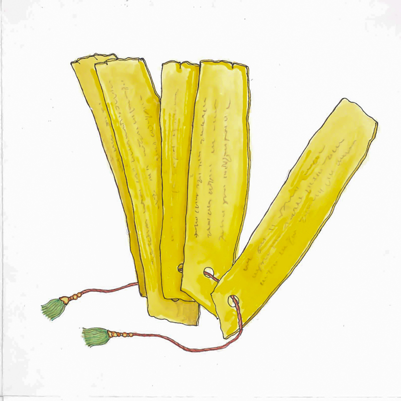 Sama VedaSama Veda or “Song of wisdom” is the third of the four Vedas, represented here as ola leaves on which chants are scribed. Ninety percent of its 1,875 stanzas are derived from the Rig Veda. It is a collection of hymns specially arranged and notated for chanting with a distinctive melody and cadence by the Udgata priests during yajna, fire ceremony, together with stanzas from the Yajur Veda. This Veda represents the oldest known form of Indian music.
