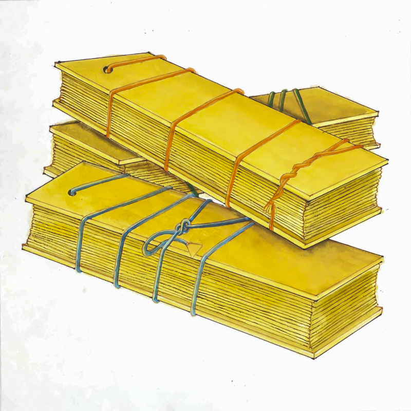 Atharva VedaArthava Veda, from Atharva, the name of the rishi said to have compiled this fourth Veda. It is shown here as a collection of palm-leaf books. The Atharva consists of 20 books and 720 hymns. Considered the last Veda recorded, it consists of mostly original hymns (rather than replications from the Rig Veda). In recognition of its abundant magical charms and spells, it is known as the Veda of prayer.