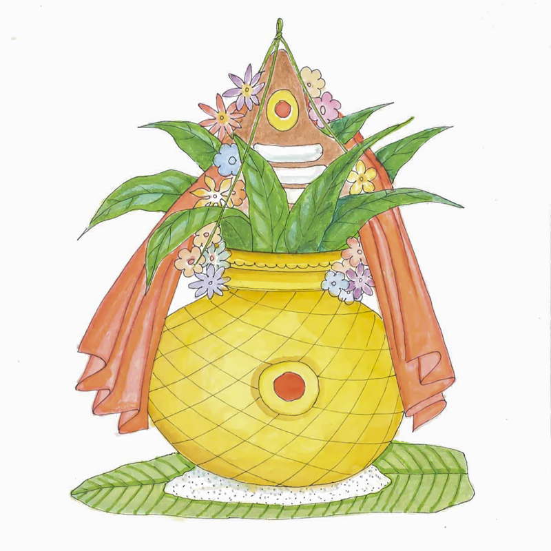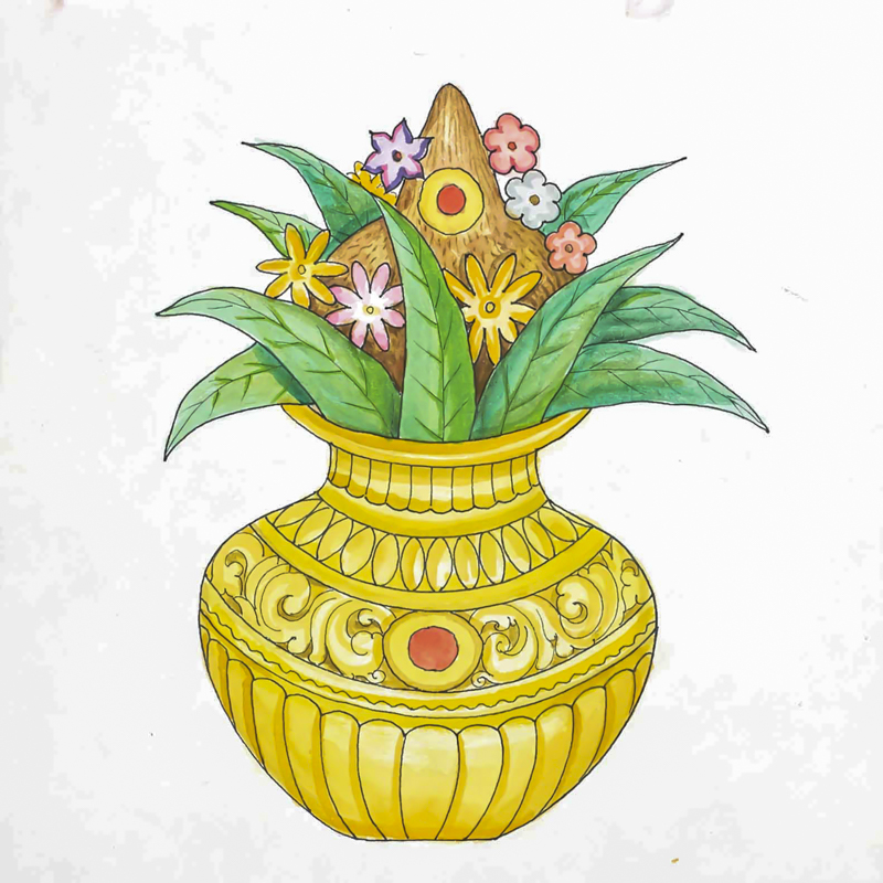 Offering PotKalasa is a water pot or jar. In temple rites, a pot of water, kalasa, topped with mango leaves and a husked coconut, represents the Deity during special pujas. Kalasa also names the pot-like spires that adorn temple roofs.