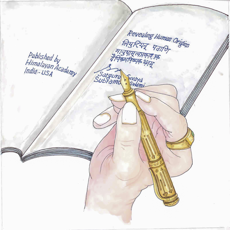 Guru' WritingsHere Gurudeva is shown holding a pen and writing his amazing legacy of books which contain the fullness of Saiva Siddhanta.